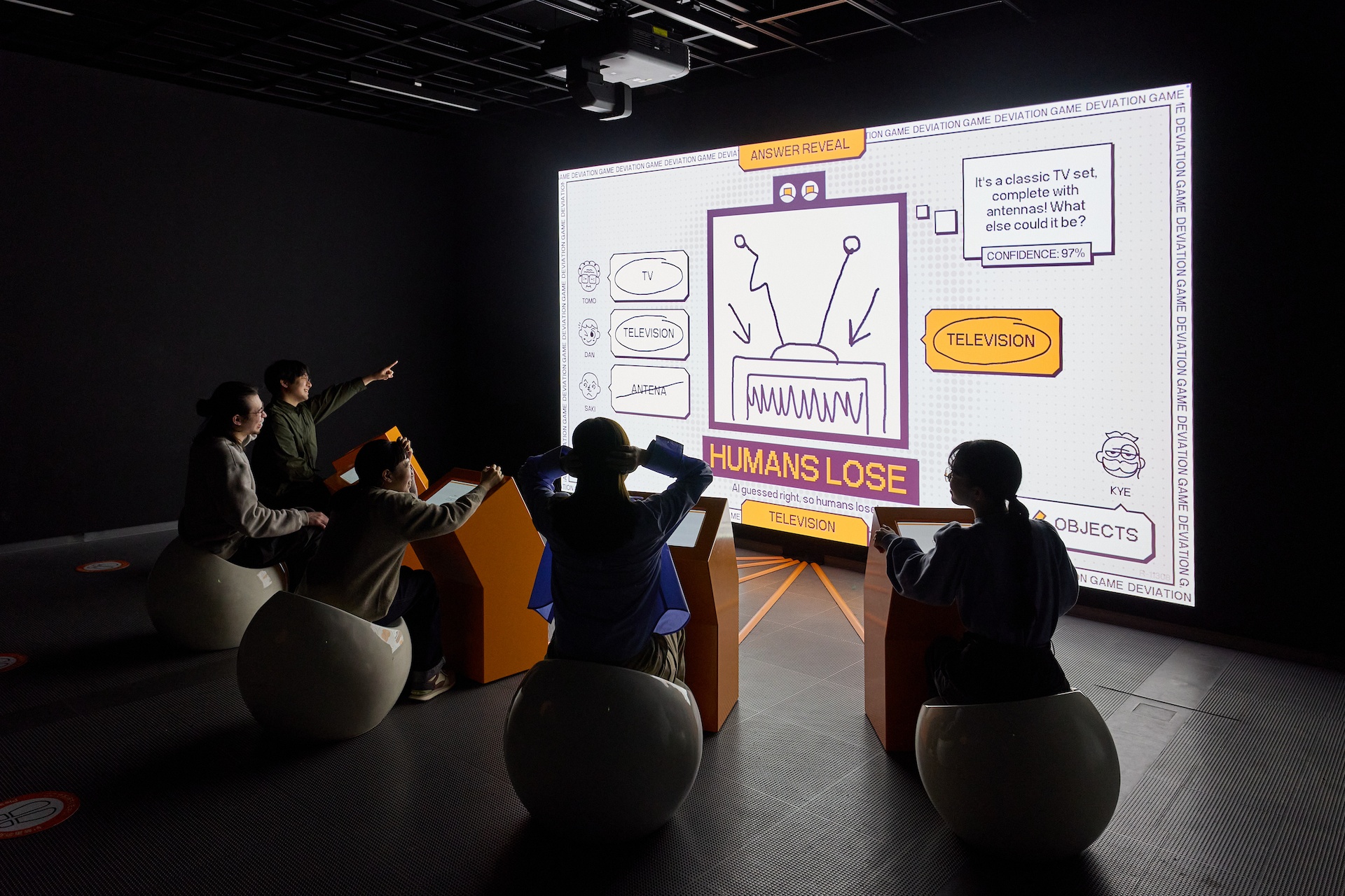 Deviation Game is a game-based experiment exploring the human potential to create beyond the knowledge of AI models. In this game, players must draw prompts like “cat” or “democracy” in a way that fellow humans can recognize—but an image recognition AI model can’t. If at least one human guesses correctly and the AI does not, humans win; if the AI guesses correctly, humans lose. After each game, participants decide whether their drawing can be used for AI training or be deleted, influencing how the model evolves.