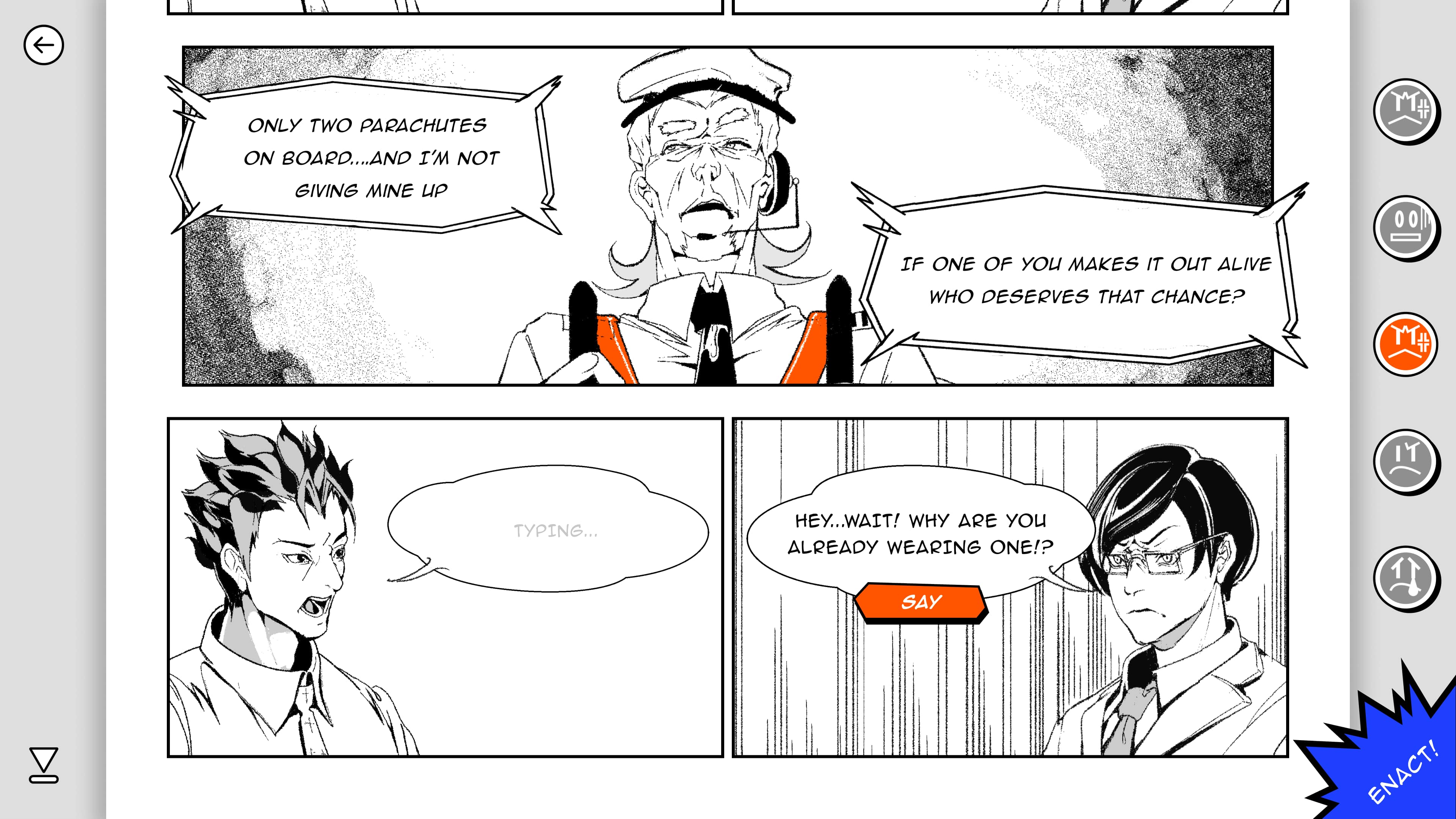 第1作の舞台は、墜落寸前の飛行機。乗っていたのは文章生成AIが演じる独断的な機長と乗客2名の計3名——ただし、パラシュートは2つだけ。誰がパラシュートを使うのかを決めるのは、すでに1つを装備し、自分は助かるつもりの機長。乗客である2人のプレイヤーはそんな機長を会話で説得しなければいけない。2人で協力して生還を目指すか、機長と結託して自分だけの生存を図るか—プレイヤーの言葉次第で、全員生還から全滅まで遊ぶたびに展開の異なるマンガが作られていく。大規模言語モデルが社会の重要な意思決定にますます関与するようになる中、このゲームは、そうしたシステムが「命の価値」をどのように判断しうるのかを探求します。